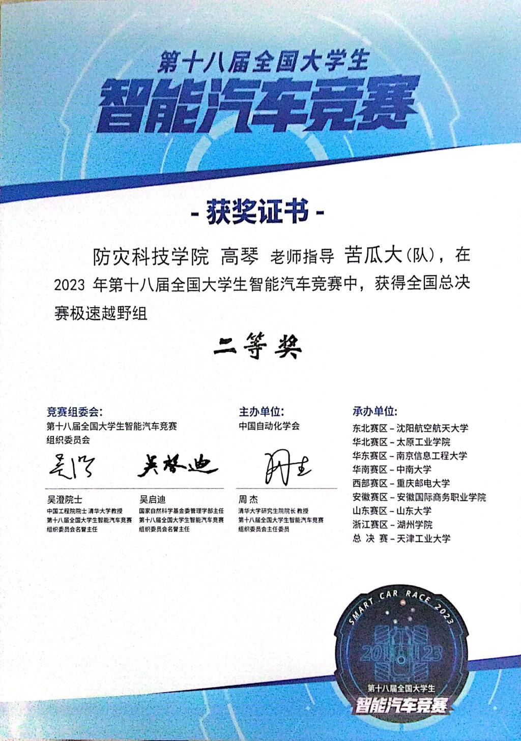 2023年8月17日-8月20日,第18届全国大学生智能汽车竞赛全国总决赛在天津工业大学圆满举办。由澳门电子澳门电子pg游戏官网高琴老师指导,刘苑苑、黄庆成、冯伟同学组成的竞速类“极速越野组”,以华北赛区第5名的好成绩进入全国总决赛,历经三天的现场环境适应、预赛和决赛层层挑战,最终进入全国20强,荣获全国二等奖。