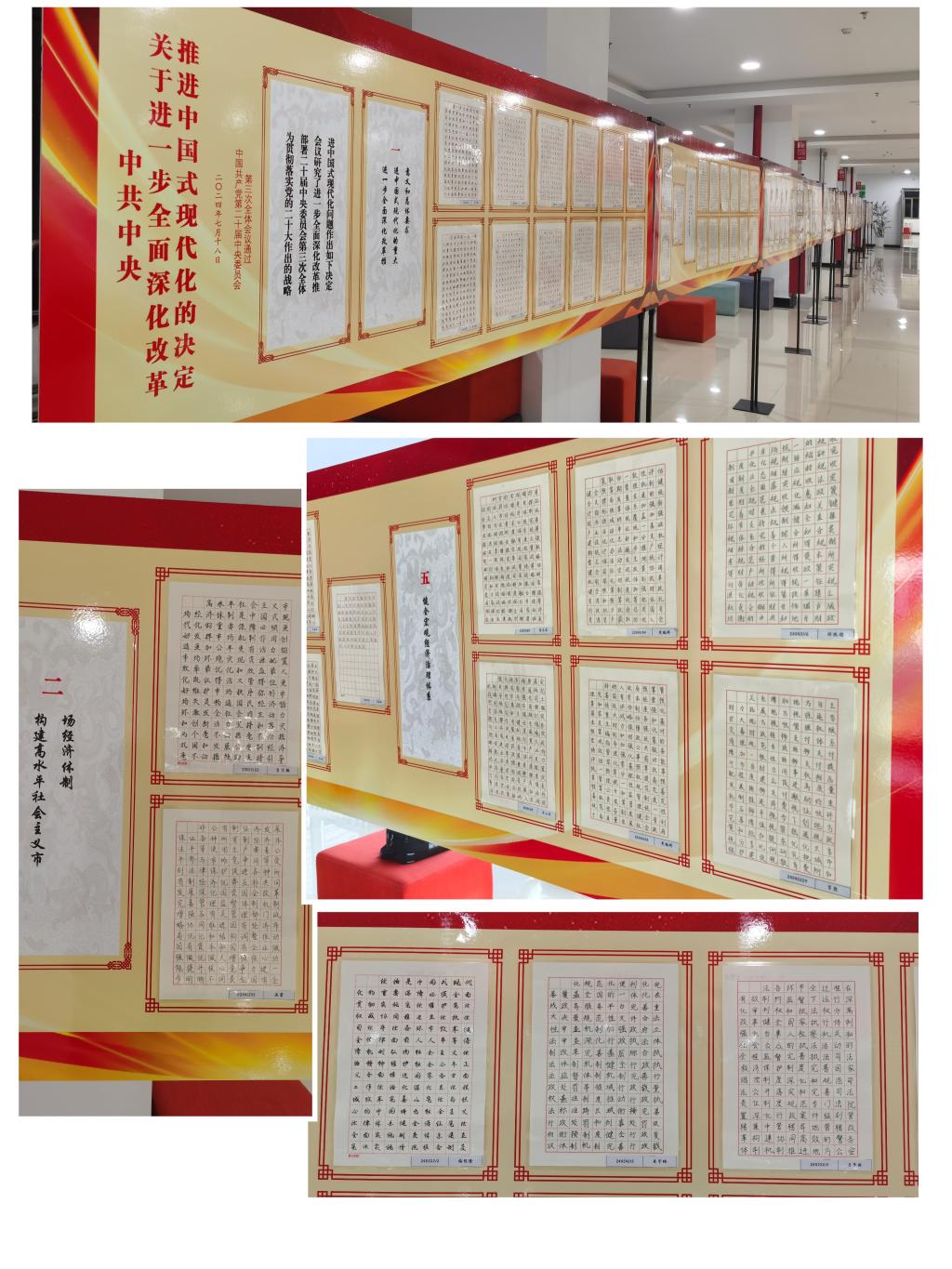 自10月15日启动以来,北辰园“一站式”学生社区1700余名同学热烈响应、积极参与。活动历经征集遴选阶段、重点创作阶段、补充完善阶段、设计布展阶段和作品展出阶段。硬笔书法作品由创作同学按顺序将《中共中央关于进一步全面深化改革、推进中国式现代化的决定》全文抄写,软笔书法作品和绘画作品分别由指定同学按照主题要求自主创作完成,最终141幅硬笔书法作品、26幅软笔书法作品、19幅绘画作品入围参展。