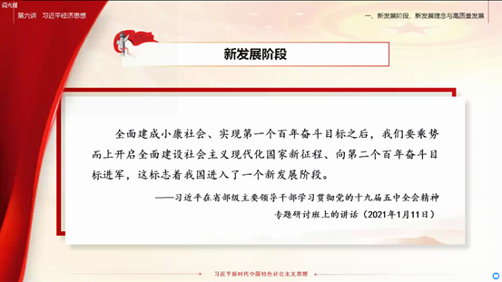 阎光耀老师以习近平总书记的讲话带入主题,围绕“新发展阶段、新发展理念与高质量发展”、“依托新一轮科技产业革命促进创新协调绿色发展”、“适应百年未有之大变局构建新发展格局”、“在共享发展中实现全体人民共同富裕”等四个方面进行有关习近平经济思想的领学。