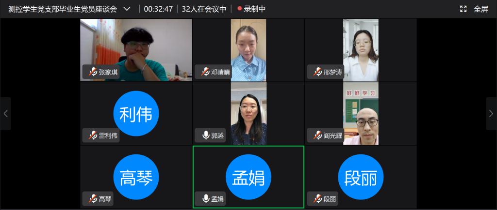 为了进一步关怀和落实毕业生就业工作,提升毕业生爱校荣校及党员身份意识,营造健康、和谐、文明、温馨的毕业离校氛围,2022年6月12日下午,澳门电子pg游戏官网测控学生党支部联合测控教师党支部在线上召开了毕业生党员座谈会。会议由测控学生党支部书记郭越老师主持,测控学生党支部2018级毕业生党员、党支部支委、非毕业生党员、测控教研室教师党员以及学院党总支副书记阎光耀老师参加了本次会议。