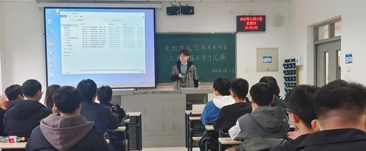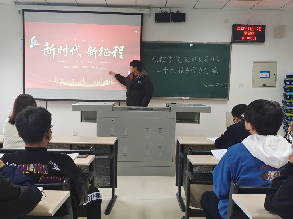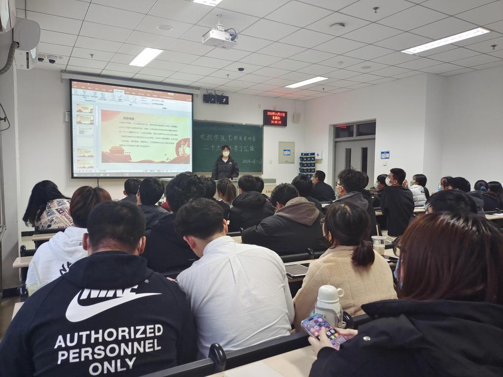 为深入学习领会党的二十大精神,推动党的二十大精神入脑入心,澳门电子pg游戏官网党总支于11月17日16:00在天仪楼113举办了党员发展对象对党的二十大报告学习汇报活动。学院党总支书记贾甚杰、专职组织员王立、通信学生党支部书记胡治国、学生党建办公室负责同志以及全体党员发展对象参加活动,活动由党建办公室副主任王英杰同志主持。
