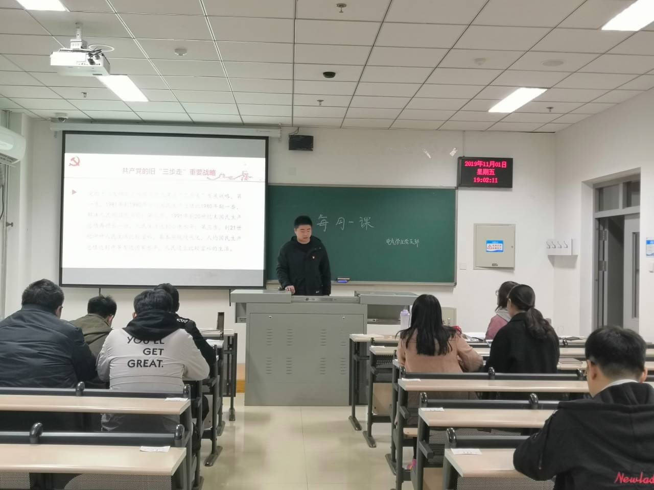 随后,李红豆同学与大家分享了学习《“两步走”发展战略》的心得,他讲到:“两步走”的第一阶段是指:从2020年到2035年,在全面建成小康社会的基础上,再奋斗15年,基本实现社会主义现代化。第二阶段是指:从2035年到本世纪中叶,在基本实现现代化的基础上,再奋斗15年,把我国建成富强民主文明和谐美丽的社会主义现代化强国。