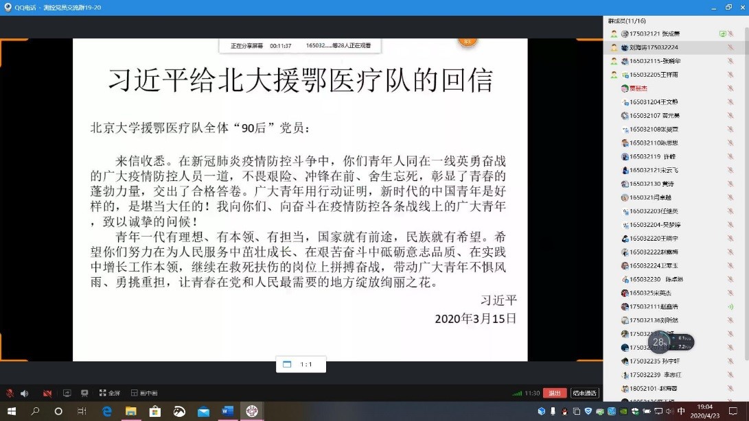 接着刘海涛同志带领支部党员一起朗读习近平总书记给北大援鄂医疗队的回信原文,深切体会习近平总书记对“90后”青年一代的关怀和期望。习近平总书记在回信中说“广大青年用行动证明,新时代的中国青年是好样的,是堪当大任的!”并表达了自己对北大援鄂医疗队深深的关切和问候。