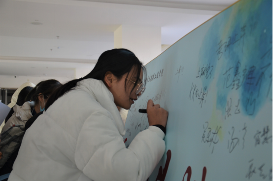 然后为他们发放考研必备文具袋,内含参加考试所必需的的文具。最后,学长学姐们纷纷在考研签名板上写下自己的目标以及祝福。