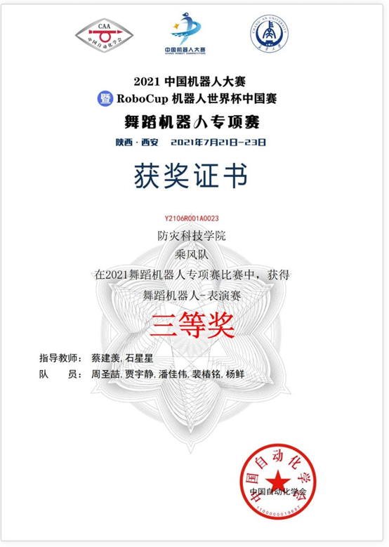 7月30日至8月1日,澳门电子澳门电子pg游戏官网学生于“2021中国机器人大赛暨RoboCup机器人世界杯中国赛”中喜获佳绩,其中,北辰队(杨爽、 郝汛舟、雷付路、马文武)获得武术擂台赛-自主仿生机器人散打项目国家级一等奖、定倾队(郝汛舟、夏仲言、杨爽、牛聪仁)获得武术擂台赛-体感仿人格斗项目国家级三等奖;乘风队(周圣喆、贾宇静、潘佳伟、裴椿铭、杨鲜)获得舞蹈机器人-表演项目国家级三等奖。