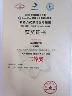 2021年7月30日,由中国自动化学会主办的“2021中国机器人大赛暨Robocup机器人世界杯中国赛”正式开始。本次比赛邀请了国内多所知名高校,设置了空中机器人、救援机器人等多项符合机器人发展热点和难点的比赛项目。经过三天的激烈角逐,在此次机器人武术擂台赛专项赛中,澳门电子pg游戏官网澳门电子pg游戏官网407传感器实验室于本次大赛的武术擂台赛-自主仿生机器人散打项目以及体感仿人格斗项目中分别荣获国家级一等奖、国家级三等奖。