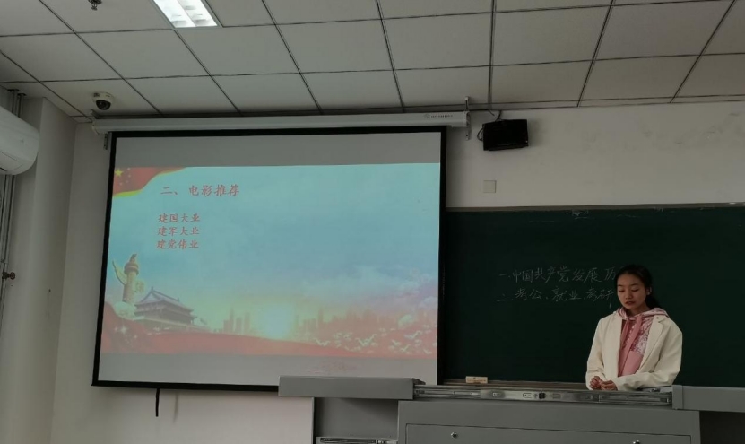 然后,团支书向大家推荐了建国大业、建军大业以及建党伟业三部电影,并提出当代大学生要如何响应党的号召,为祖国做出贡献等问题。